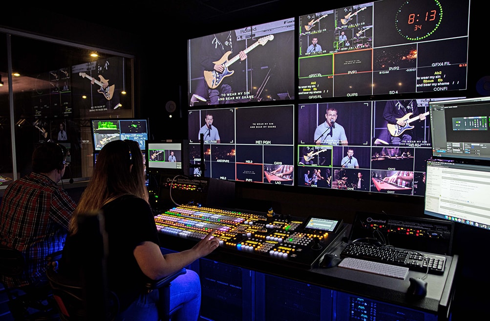 At least eight cameras are used for each service, including small cameras that highlight band instruments and three PTZ cameras that mostly provide wide shots for the online feed. Before, the church ran cables from each camera to the switcher. Now, there are I/O ports throughout the facility, so cameras can be connected via SDI or fiber.