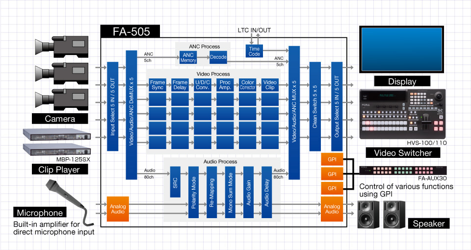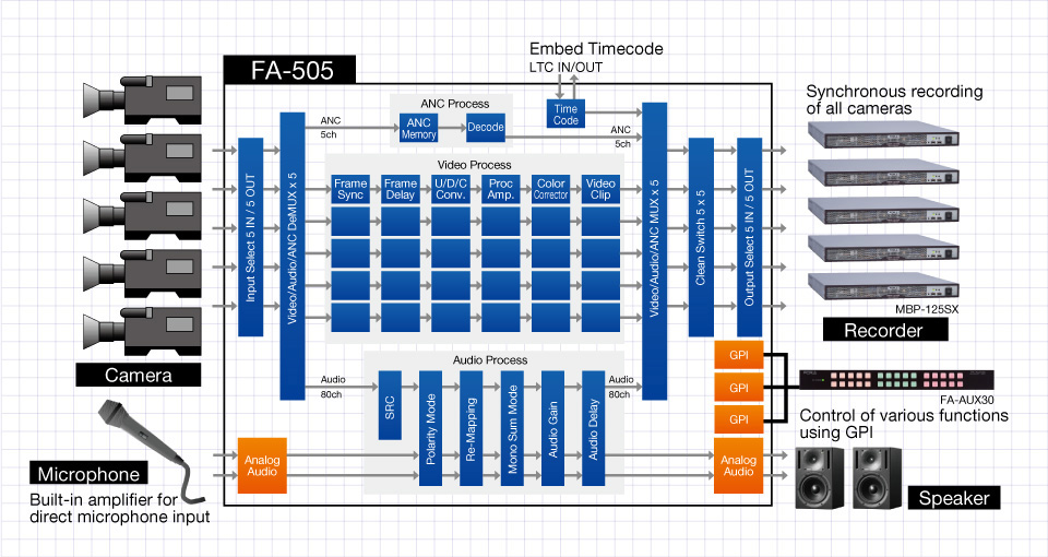 - The FA-505 can be used for multi-camera recording using multiple camera units, and allows the video feed from each camera to be delay-adjusted, color-corrected, and synchronized.