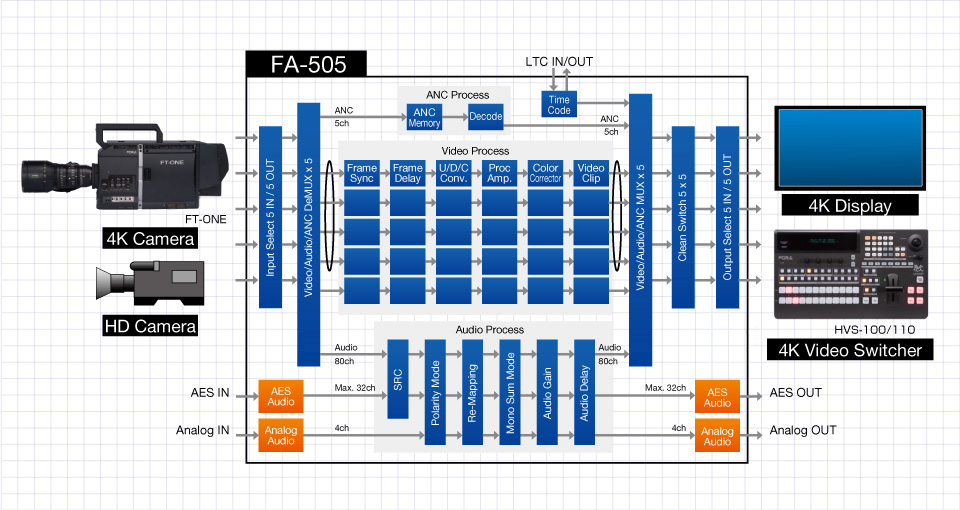 - The FA-505 can also be used as a frame synchronizer/processor for a 4K camera, allowing delay adjustment, color correction, and synchronization of video from one 4K camera (maximum).