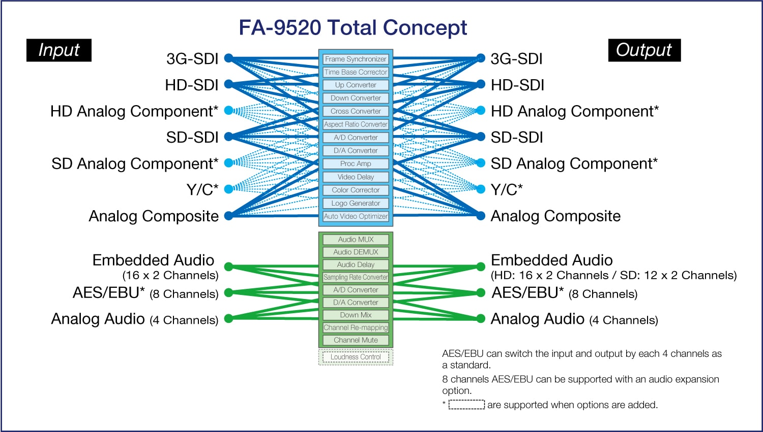 The FA-9520 is a dual channel multipurpose signal processor loaded perfectly for a variety of applications including: master control, mobile production, post production services, live production and more. We have developed the FA-9520 to provide a dual channel version of our industry leading FA-9500 processor. The FA-9250 supports 3G-SDI, HD/SD-SDI, and analog composite I/O. In addition to its functionality as a frame synchronizer, it also provides: up/down/cross/aspect converter, full color corrector and automatic video optimizer (AVO) as standard features. The wealth of features in the FA-9520 can replace many single purpose units. This is a complete toolbox for almost any video need, all with FOR-A’s legendary signal quality and reliability.