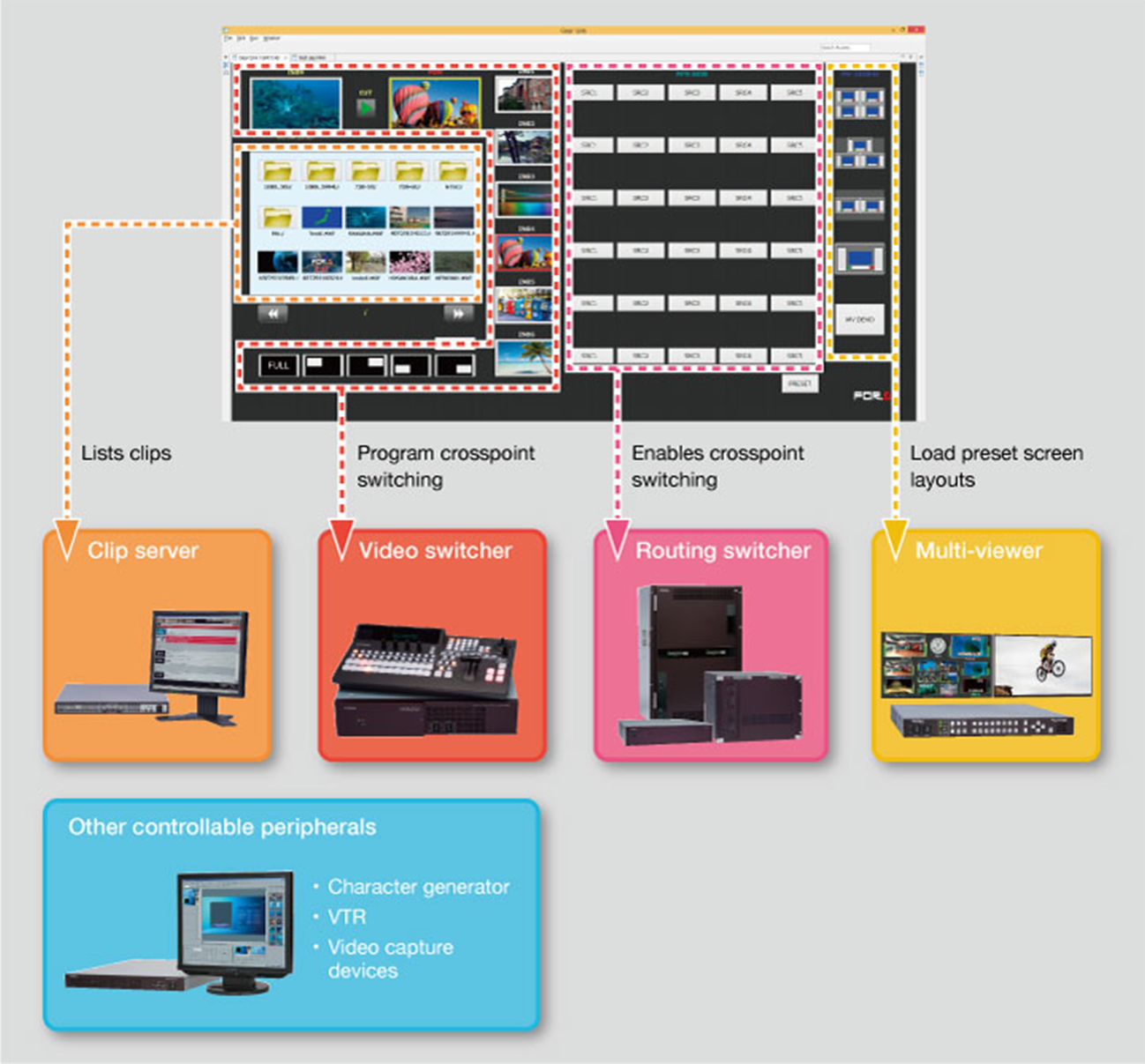 Software for centralized visual control of video switchers and other peripherals. Customize buttons and the screen layout for a bird’s-eye view of workflows and convenient system control.