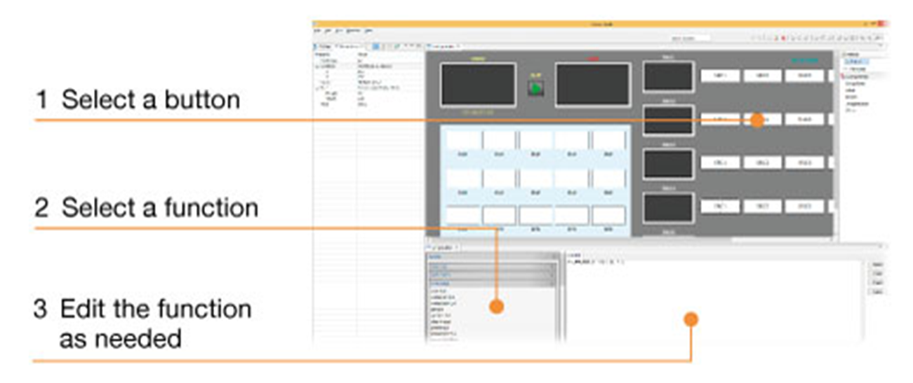 Customize button functions using JavaScript, and edit actions triggered by changes in status of connected device. p>