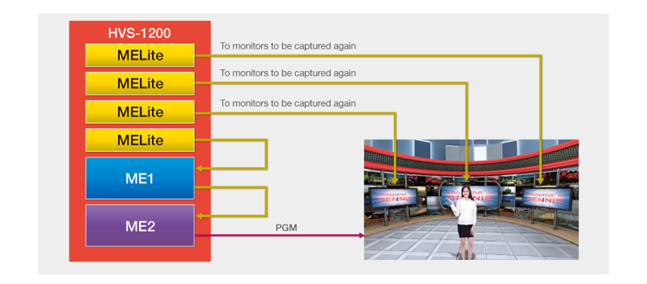 - HD mode: Combine up to eight keyers for an M/E bus (4 keyers + 4 FLEXaKEY). - P-in-P display is possible using an AUX bus. Assigning FLEXaKEY to an MELite enables use as an upstream key.