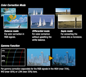 Three color correction functions (balance, differential and sepia)