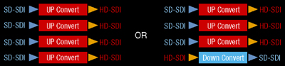 Up to 4 channels can be installed for up converter input HVS-38UC or down converter output HVS-38DC*. This enables up-converted signals to be assigned to the M/E, AUX, and KEYER buses in the same way as external input and internal still stores.