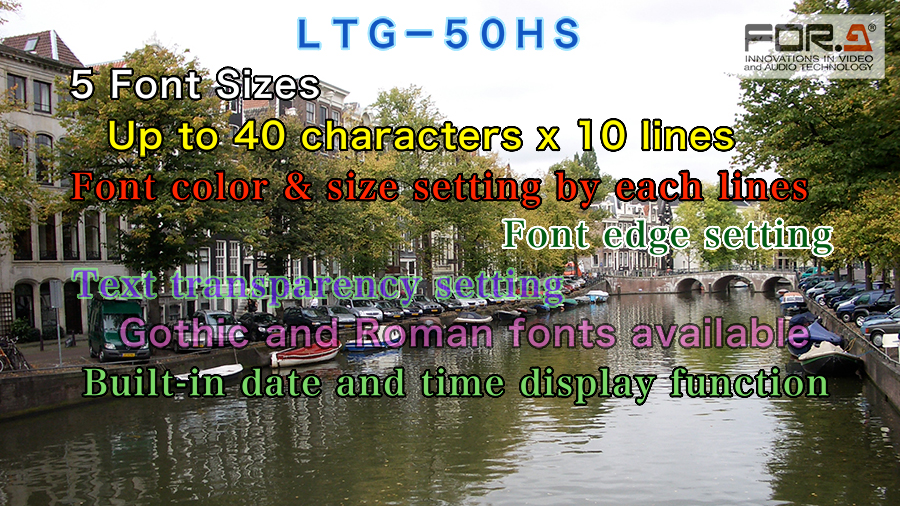 The LTG-50HS is an HD/SD logo/title generator capable of superimposing camera titles, the date and time, logos, and graphics on input video signals.