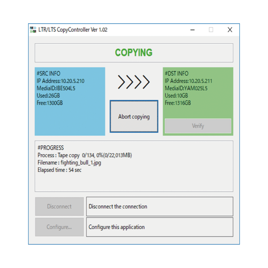 Installed on a computer connected via Ethernet to 2 LTR/LTS units, enables LTO tape files to be copied from either unit.