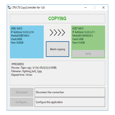 Installed on a computer connected via Ethernet to two LTS units, enables LTO tape files to be copied from either unit.