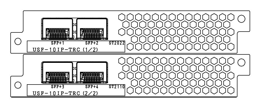 Video-over-IP module for Universal System Frame USF-212BS. USF-10IP Series converts video, audio and ancillary data between IP formats (SMPTE ST 2022-6/SMPTE ST 2110, SMPTE ST 2022-8/SMPTE ST 2110) and between IP and SDI. Two dual (USF-10IP-TRC/USF-10IP-TRC-FS) or dual (USF-10IPSDI6-FS/USF-10IPSDI12-FS) 10 GbE (SFP+) modules can be installed to support hitless operation.