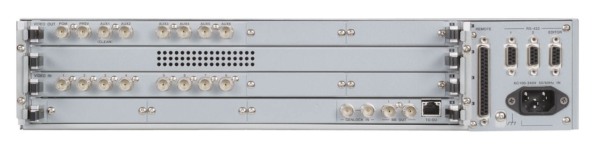 The main unit incorporates up to 16 inputs and 16 outputs, FS function, still store, Proc Amp, clip function, DVEs, keyers, and a wide array of other functions in a compact EIA 2RU size. A special main unit with a built-in redundant power supply is also available with all these functions incorporated into an EIA 3RU body size.