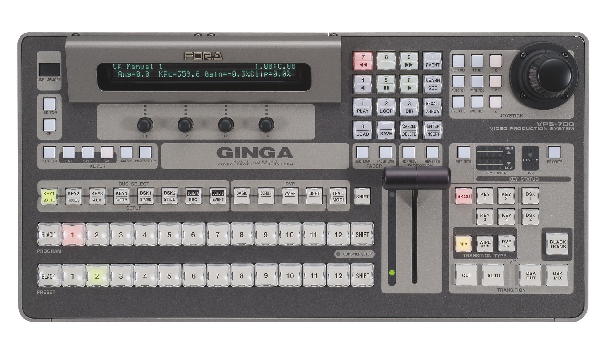 The compact and easy-to-use control panel of the VPS-700 has basic PGM/PST rows and fader levels, 3-axis joystick, parameter display, and optional touch panel controller. Despite these numerous ground-breaking functions, the VPS-700 will not overwhelm you with complicated operations.
